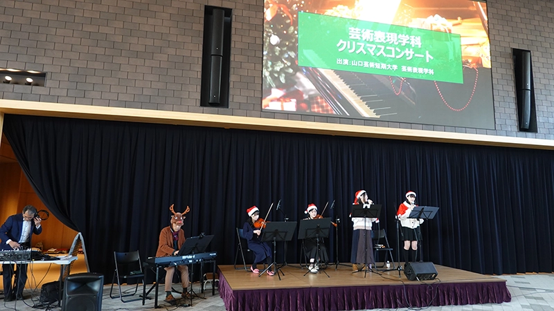 11月22日(土)、芸術表現学科の「地域課題解決演習(PBL)」および「表現実践」を履修する学生が、湯田温泉こんこんパークと連携し、地域参加型イベント「Christmas Art Festival(クリスマス・アート・フェスティバル)」 を企画・運営しました。本イベントは、芸術表現を通じて地域とつながる、学科独自の実践授業の一環として行われたものです。