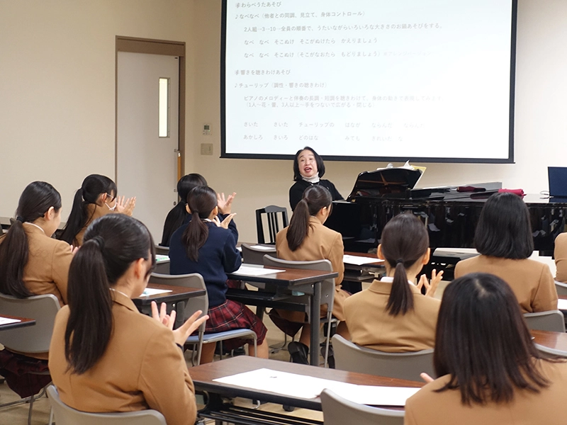 その後の体験授業は、保育学科の先生による「リズム遊び」、「季節の造形制作」の2講座を受講してもらい、一足早めに学生気分を味わってもらいました。音楽に合わせて体を動かしたり、クリスマスを前にしてグッズを作ったりと、楽しく受講ができたようです。特に皆で協力して活動している姿を見て、こんな生徒たちが2年後に入学してくれるとうれしいなと感想をこぼされていました。