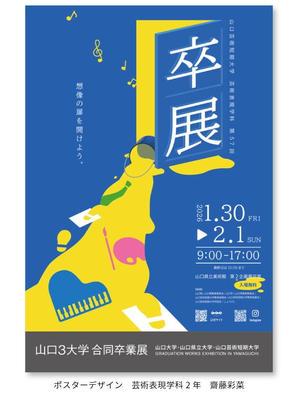 1月30日から2月1日の3日間にて芸術表現学科の学びの集大成として、「第57回 卒業制作展」を山口県立美術館で開催します。
