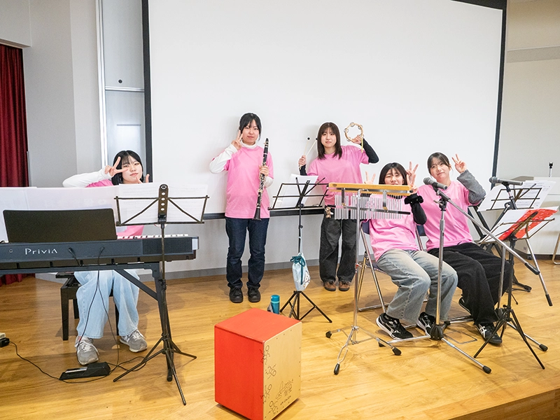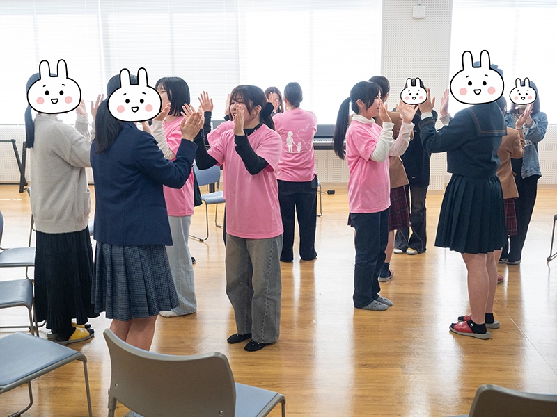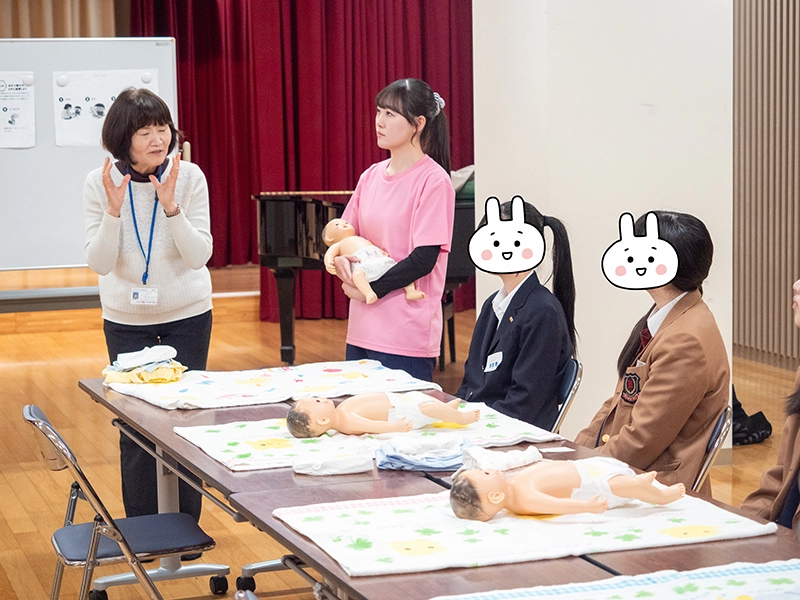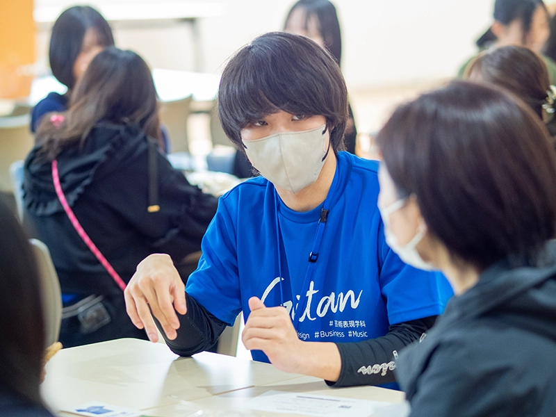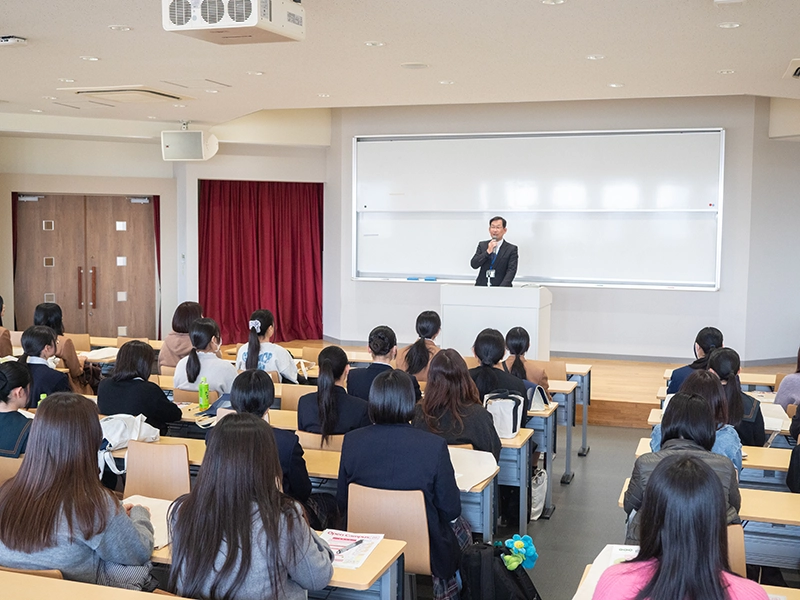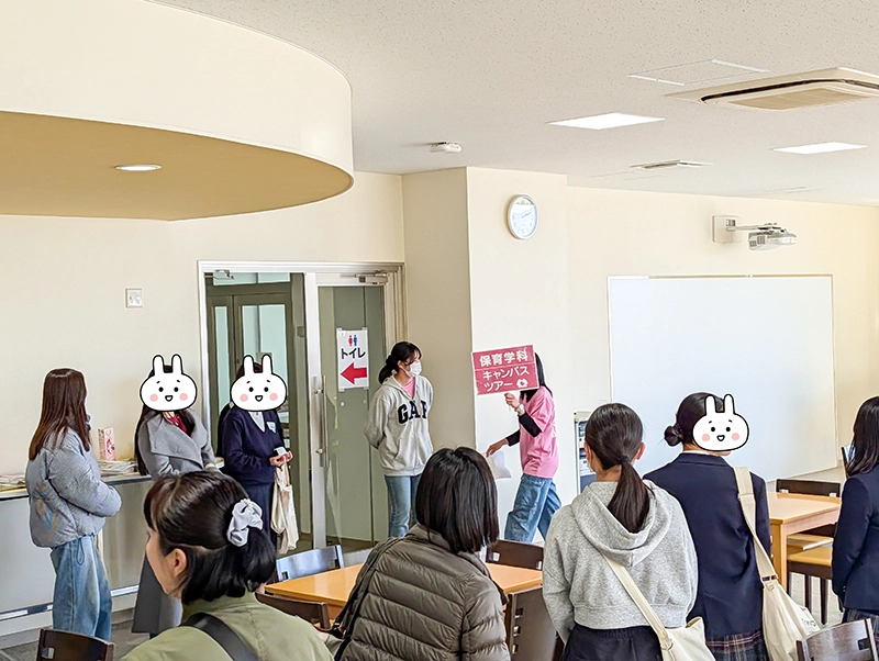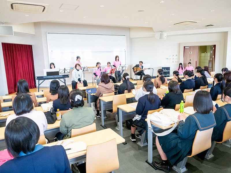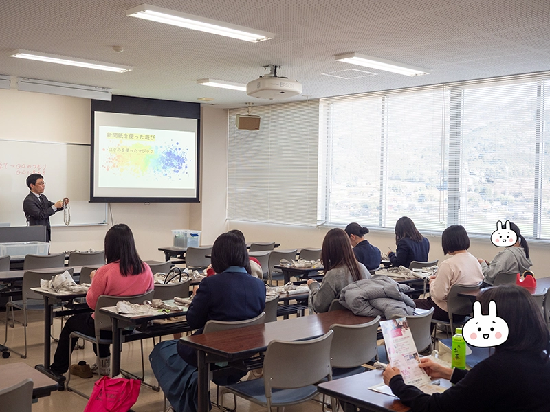 保育学科は、「ウエルカム・コンサート」、「学科・入試について知ろう」の後、キャンパスツアーを行いました。その後、保育「赤ちゃんを知ろう」では赤ちゃん人形を利用して特性等を楽しく学んでもらいました。造形「新聞紙で遊ぼう」では新聞紙を使っていろいろな遊びを体験してもらいました。音楽「保育の音楽表現遊び」では保育現場でよく歌われている曲やふれあい遊び等を学生と一緒に行いました。どれも保育学科の魅力が満載の学び体験で、一足早めに大学生気分を味わってもらうことができたようです。